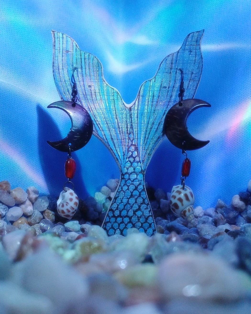 As bijoux são confeccionadas com madeira de côco e madeira pinus - essas são cortadas artesanalmente e pirogravadas manualmente - e adornadas com conchas reais. Todo o processo de confecção das bijouterias é feito artesanalmente com materiais naturais.