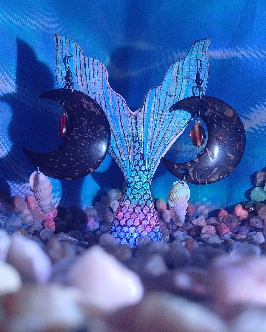 As bijoux são confeccionadas com madeira de côco e madeira pinus - essas são cortadas artesanalmente e pirogravadas manualmente - e adornadas com conchas reais. Todo o processo de confecção das bijouterias é feito artesanalmente com materiais naturais.