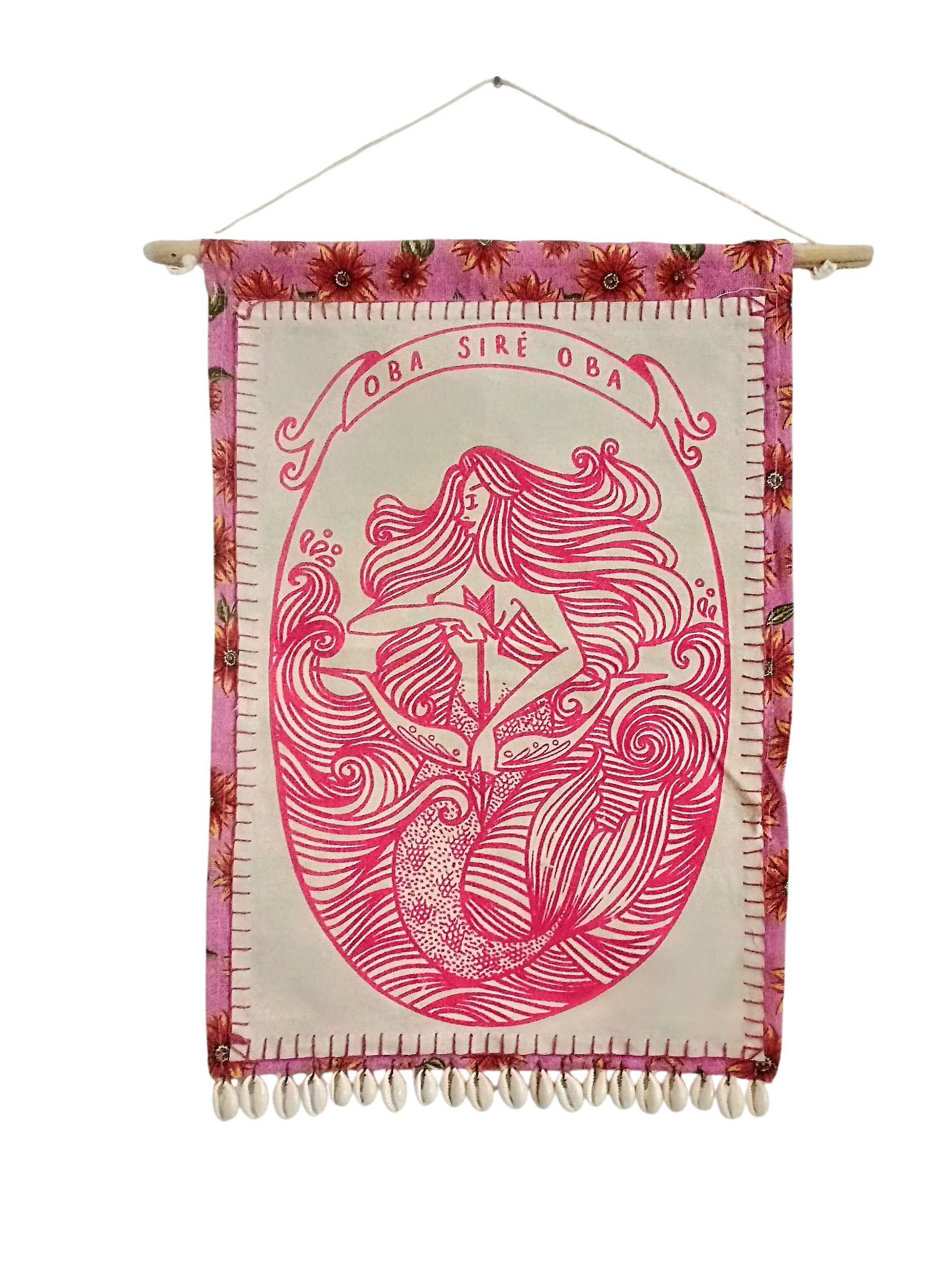 ・゚🪼 Estandarte tamanho A3 de Obá, ilustrado em serigrafia, costurado em chita e adornado com conchas luria cineria🪼・゚