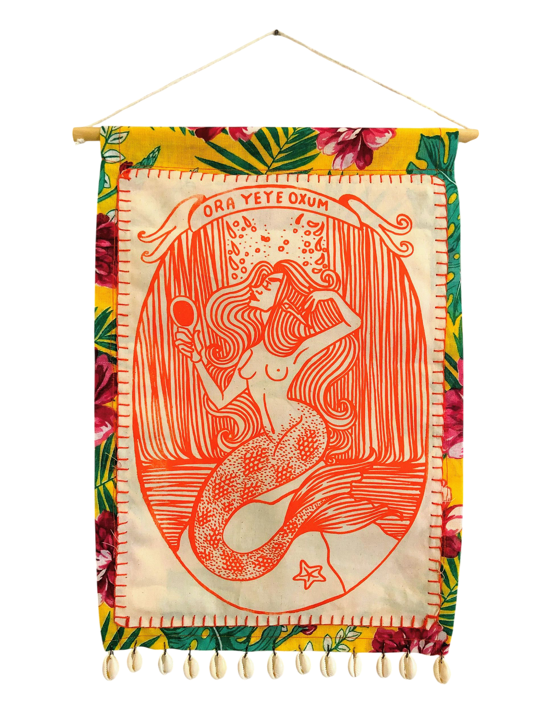 ・゚🪼 Estandarte tamanho A3 de Oxum, ilustrado em serigrafia, costurado em chita, adornado com conchas luria cineria 🪼・゚