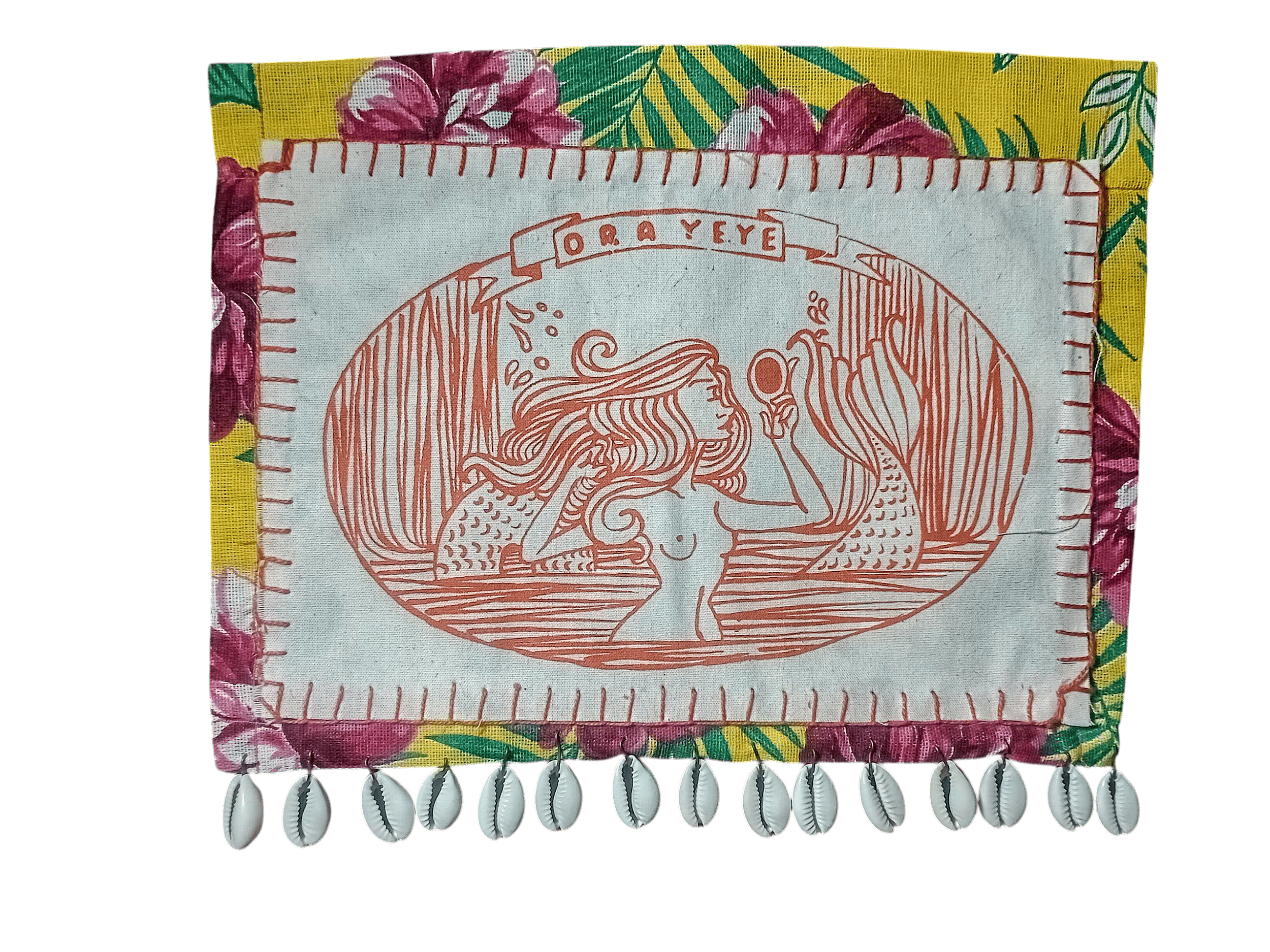 ・゚🪼 Estandarte tamanho A4 de Oxum, ilustrado em serigrafia, costurado em chita e adornado com conchas luria cineria (acompanha segurador)🪼・゚